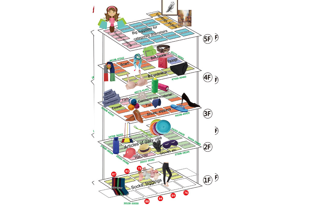 There are about 16,000 wholesale outlets selling textiles, Socks, leggings, caps, shoes, slippers, ties, towels and garment raw materials.